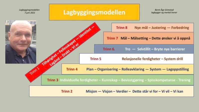 Mine kurs og foredrag om ledelse og lagbygging er forankret i Lagbyggingsmodellen, som med sine 8 trappetrinn dekker alt du trenger for å bygge lag enten du er leder i næringslivet eller trener/ leder innen idrett /organisasjon (se bildet over).